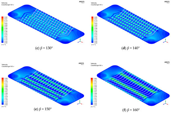 The speed distribution charts where the plate contacts are located when h = 2 mm, λ = 7.6 mm are shown in Figure 10a–f. It is noticed that as the corrugated angle increases, the number of contacts in the plate decreases, and the blue area where the vortex exists behind the contact also increases. As the corrugated angle gradually increases, the flow form becomes tortuous, and the fluid will reflect at the contact, causing the fluid to form a vortex behind the contact, and the diameter of the vortex increases with the increase of the angle of the corrugation.