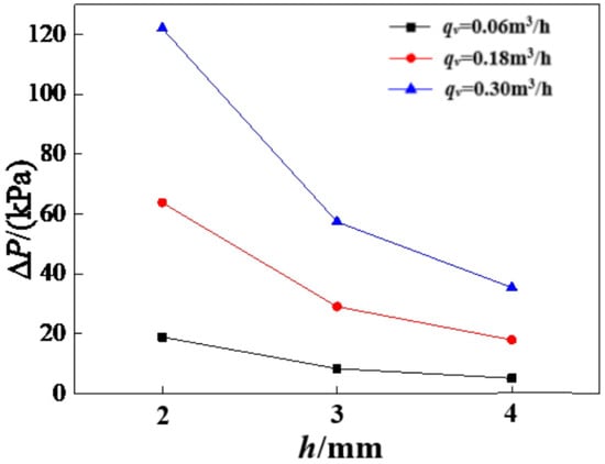 The effects of corrugated height h on the pressure drop (β = 130°, λ = 7.6 mm) are shown in Figure 11. It is noticed that as the corrugated height increases, the pressure drop value gradually decreases. The pressure drops values at the inlet and outlet of the plate heat exchanger channels reflect the resistance characteristics of fluid flow. The tangential force of the plate in the heat exchanger channel on the fluid and the resistance of the contact to the fluid are the main reasons for the pressure drop. The tangential force of the plate on the fluid increases with the increasing corrugated height, the flow rate in the channel reduces the flow resistance.