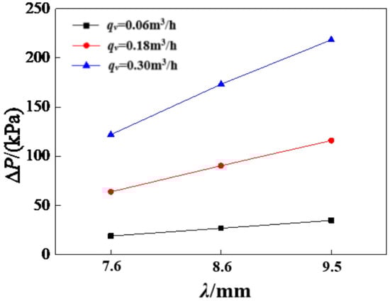 The effects of corrugated spacing λ on the pressure drop (β = 130°, h = 2 mm) are shown in Figure 14. It is noticed that the pressure drop value increases with the increasing corrugated spacing. The tangential force of the plates on the heat exchanger channels and the resistance of the contacts to the fluid are the main reasons for the pressure drop. With the corrugated spacing of increases, the number of contacts between the plates decreases and the vortex disturbance formed in the heat exchanger channel is enhanced, so the fluid flow resistance is increased.