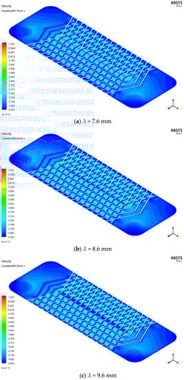 The speed distribution charts of the plate where the plate contacts are located when β = 130°, h = 2 mm is shown in Figure 16a–c. It is noticed that as the corrugated spacing increases, the number of contacts decreases, the velocity field distribution becomes more and more uneven, and the diameter of the blue area where the flow rate is relatively low behind the contacts also increases. The blue area behind the contact is the vortex area in the flow field. When the corrugated spacing is relatively small, the cross flow in the fluid accounts for a large proportion, the contacts have less disturbance to the fluid, and the vortex is small.