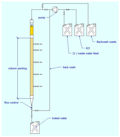Cr(VI) concentrations were determined on an Evolution 220 spectrophotometer (ThermoFischer Scientific, Waltham, MA, USA) at 540 nm, using the 1,5 diphenyl carbazide method. Total Cr was measured using inductively coupled plasma (ICP) (VARIAN, LIBERTY AX Sequential-ICP-OES, coupled with SPS3 sample preparation system, and LYTRON cooling system). The difference between total Cr and Cr(VI) was taken to be Cr(III). ICP was also used to measure concentrations of Cu, Mn, Ni, Pb, and Zn in electroplating wastewaters. Columns were manufactured in our lab. Masterflex L/S dosing pump with four channels was used to supply feeds at the desired flow rate.