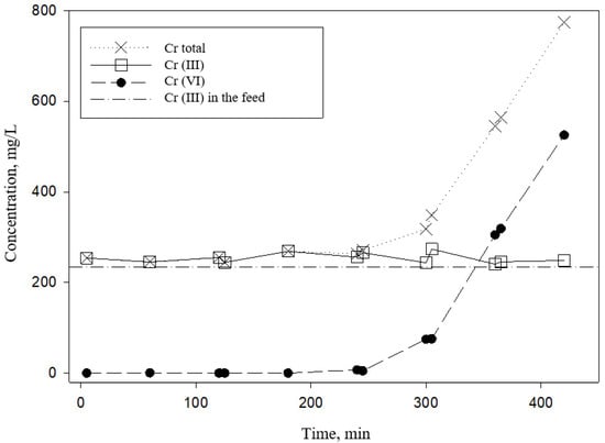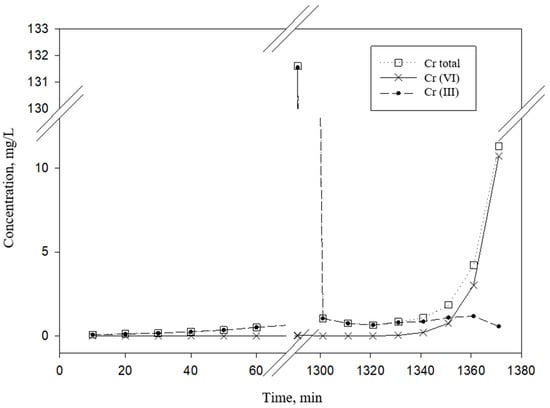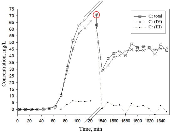 Chromium concentrations in the eluent. Initial Cr(VI) feed concentration (from electroplating wastewater) = 620 mg/L, flow rate = 200 mL/min, operation time = 5 min followed by dark interval of 55 min, and T = 25.0 °C.