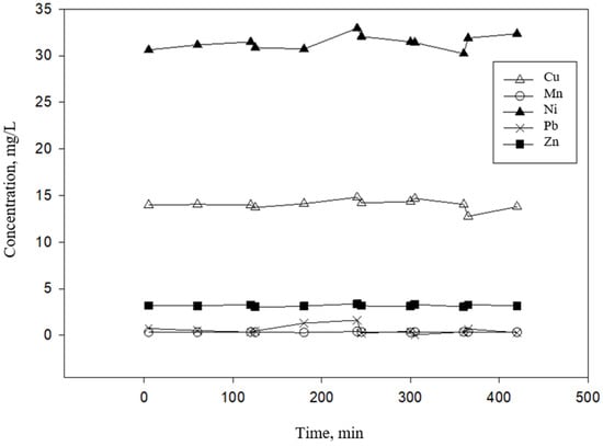 Table 1 lists the heavy metals concentrations. The column processed 6.0 L of 100 mg/L Cr(VI) in the previous run before the breakthrough concentration of 1.0 mg/L was exceeded, as shown in Figure 2. The column was therefore expected to process only 1.0 L of 600 mg/L Cr(VI). Hence, an additional interval of 55 min, during which the flow was interrupted, was introduced to maintain a comparable load per unit time on the adsorbent. Figure 4 shows that with ca. 6-fold higher concentration of Cr(VI), 5.0 L of feed was processed before the breakthrough concentration was reached. Moreover, the other metals present in the wastewater had no effect on adsorption. The concentrations of these metals remained at values around the original feed concentrations (Figure 5), with slight fluctuations resembling a sine wave when examined closely. This pattern is consistent with repeated cycles of adsorption-desorption.