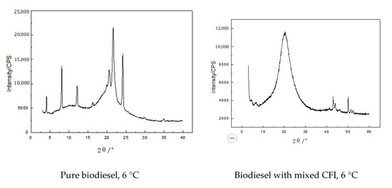 It can be seen from Figure 2 that the 2θ of pure biodiesel and biodiesel with mixed CFI has a wide diffuse scattering peak between 10° and 30°, and the 2θ of pure biodiesel is at 5.5°, 21.63°, 28.8°, 34.9°. There are sharp diffraction peaks near 36.9°, and the 2θ of the biodiesel with mixed CFI has sharp diffraction peaks near 5.6°, 20.6°, 42.6°, 46.3°, and 51.3°, indicating that both of them precipitated amorphous and crystal wax. The two diffuse scattering peaks have the same peak shape width, which indicated that the amount of amorphous wax precipitated by the two is not much different. According to references [36,37], the wax crystal peaks of the XRD pattern are analyzed, and the results are shown in Table 3. It can be seen that the crystal peak area of pure biodiesel is much larger than that of biodiesel with mixed CFI, indicating that at the same temperature and the number of precipitated crystals in the biodiesel with mixed CFI is greatly reduced. The different S values in pure biodiesel (0.720) and biodiesel with additive (0.012) indicates that the CFI changed the growth mode of wax crystals. The content of precipitated orthorhombic crystals is reduced, monoclinic crystals, and the content of orthorhombic crystals increases, while monoclinic crystals are not easy to aggregate and grow. The presence of orthorhombic crystals in the liquid phase is advantageous because it can delay the formation of three-dimensional network waxy structure, so crystals are smaller in size and easier to pass through the filter. In addition, the amount of wax crystals in the biodiesel with mixed CFI is also less, so the overall result was that the cold filter plugging point of the biodiesel with mixed CFI is lower.