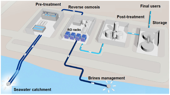 Currently, to satisfy the growing global demand for freshwater, seawater desalination technologies are being widely applied due the significant reduction in desalination cost, as well as the technological improvements incorporated within the desalination process [1,2]. These technologies have increased the security of water supplies for millions of people, and thus, seawater has become the only consistent available water source to cope with the growing shortage of freshwater [3,4]. Consequently, the seawater desalination industry has emerged as a vital sector to meet the demand of freshwater in different regions of the globe [5,6]. This industry will play a progressively vital role in guaranteeing the worldwide water supply [7].