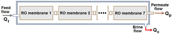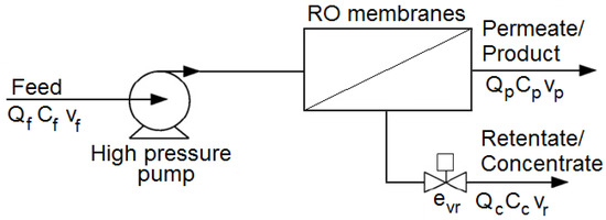 Different mathematical models for the solvent and solute transport through the RO membrane have been proposed by researchers; see, e.g., [31,32,33]. The most widely applied model is the one based on a solution-diffusion transport mechanism [34]. Figure 7 shows the diagram of the RO process used to obtain the model.