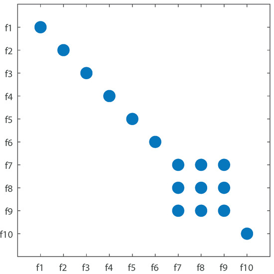 Faults that cannot be isolated from each other are displayed in Figure 9. It can be seen that from all 10 faults, seven are completely detectable and isolable, but three of them are not isolable from each other; these faults are considered as one mixed fault .