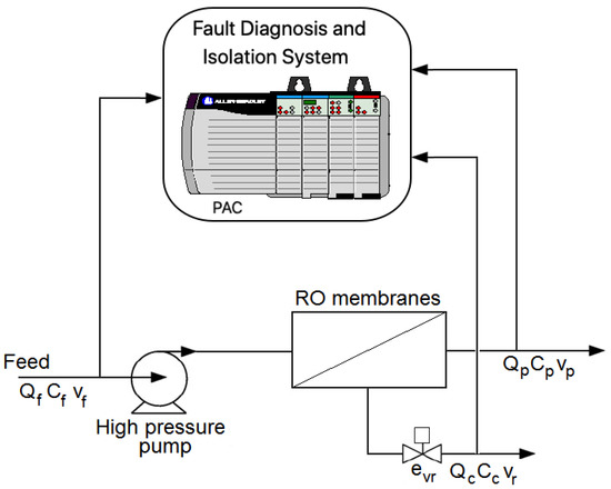 Control systems are a vital component for the process industry [13,14], and therefore also for industrial seawater RO desalination plants because they ensure optimal operating conditions, quality desalted water, and personnel safety, as well as increasing the lifetime of the plants and reducing the desalination unit costs [15,16]. These control systems involve a great amount of unit processes, actuators, sensors, and controllers that are essential for the successful accomplishment of control strategies [17]. These components run under conditions of high pressure, variable frequency, and membrane fouling or scaling, which have an unwanted cost on the performance of these plants [18]. Therefore, all these components are susceptible to faults [19]. A fault is a violation of some specific normal behavior, which can lead to poor performance or the loss of plant functions. These faults can originate safety risks for plant personnel, physical damages, energy waste, as well as lead to poor freshwater quality, making it dangerous for human consumption [20]. These safety problems support the design of fault diagnosis and isolation (FDI) systems capable of detecting possible failures and making effective decisions to impede the dissemination of their effects and to maintain the safe operation of the industrial seawater reverse osmosis desalination (ISROD) plants [21].