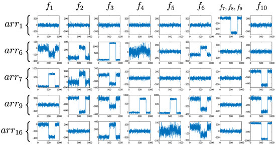 For simulation purposes, each fault of the set of faults of interest was introduced during operation for a time interval (t = 500–800 s) to evaluate the FDI system performance. In Figure 11, the residuals selected , , , , and are shown in the presence of all faults considered.