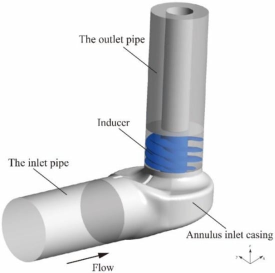 The computational domain is shown in Figure 1, which consisted of an inlet pipe, an annulus inlet casing, an inducer impeller, and an outlet pipe. An annulus casing with deflectors qas placed upstream of the inducer and aimed at forming a uniform inlet flow [17]. The inlet and outlet pipes were extended for a fully developed flow simulation (5 times the diameter of the annulus inlet casing and 7 times the diameter of the inducer blade tip, respectively).