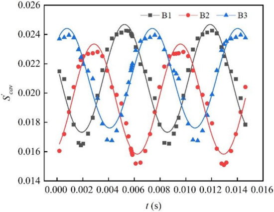 The oscillation of the cavity on the blades was monitored to understand cavitating instabilities. Figure 5 shows the variation of a nondimensional cavity area Scav’ over time on three blades of Model O. Tthe ratio of the cavity area on the blade to the area of the inlet, =Scav/Sf; from the perspective of cavitation suppression, was expected to be as small as possible. It can be seen that the cavity variation on each blade was similar. They changed in an approximate sinusoidal pattern with a frequency of 152 Hz (~f0) and a certain phase difference between neighboring blades. It can be inferred that there was rotating cavitation in the studied inducer. Such asymmetric distribution of cavities might influence the operation’s safety and stability.