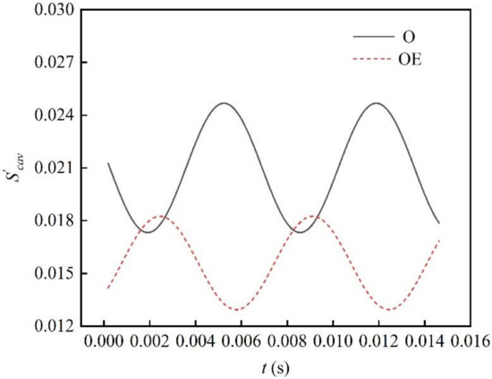 The variation of the nondimensional cavity area over time on Blade 1 of Model O and OE (cases with the equal pitch inducer).