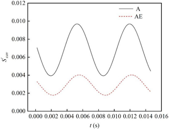 The variation of the nondimensional cavity area over time on Blade 1 of Model A and AE (cases with the varying pitch inducer).