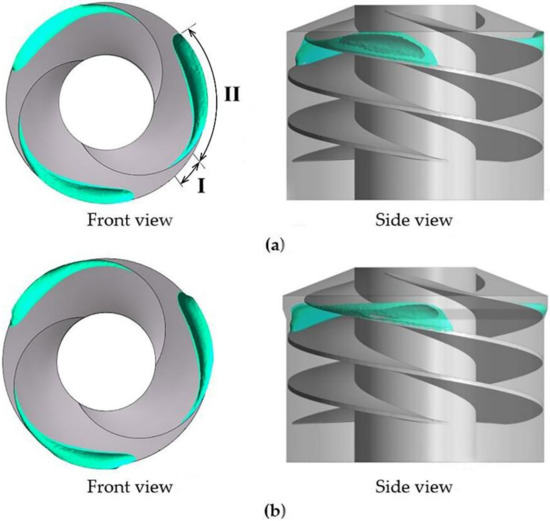 Three-dimensional cavity structures for the varying pitch inducer are shown in Figure 12a,b. Unlike the equal pitch inducer, a significant difference in cavity structures were seen in the varying pitch inducer when the step casing was applied. Cavities in Model A owned two subregions. In Model AE, only clearance cavitation was observed and nearly no leakage cavitation occurred in other cases. Thus, there was only the Type I cavity.