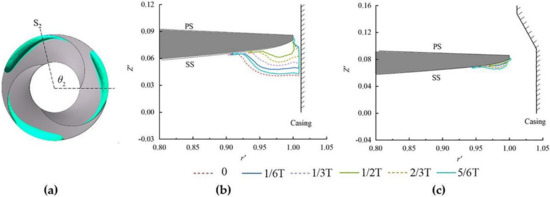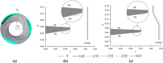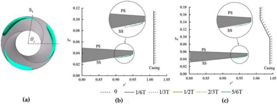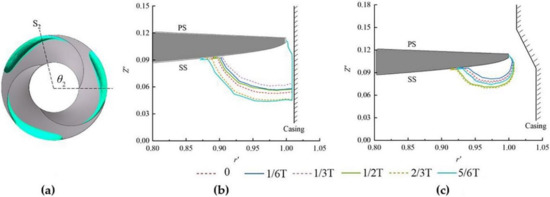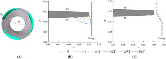 As shown in Figure 9a, the first section (S1) was in the middle of Type I. , indicates the inception position of Type I; indicates the region Type I occupies streamwise, indicating the characteristic of Type I cavitation. Figure 9b,c show the variation of cavities within 1 revolution (T) at S1 for Model O and OE. Here, PS stands for the pressure side, whereas SS denotes the suction side. Furthermore, r’ indicates the ratio of radial position and tip radius (=r/rT), while Z’ indicates the ratio of axial position and the axial length of the blade (=Z/LB). With a weak radial fluctuation and almost no axial fluctuation, the variation pattern of Type I in each case tends to be similar. We found the cavity area as O ≈ OE. indicated that the application of step casing may result in downstream cavitation inception.