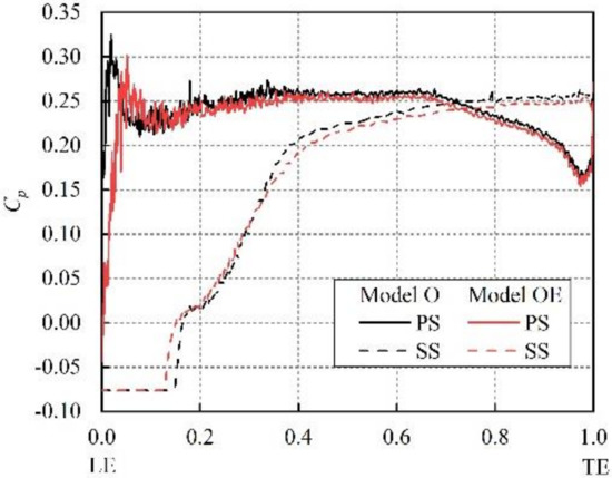 Blade loading along the streamwise direction at a 95% span for a certain blade in Models O and OE.
