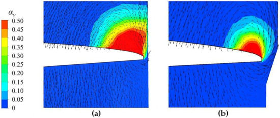 Furthermore, the distribution of the vapor volume fraction αv and velocity vectors are shown in Figure 18 and Figure 19 (Figure 18a for Model O, Figure 18b for Model OE. And Figure 19a for Model A, Figure 19b for Model AE). Clearance flow in cases without step casing (Model O and Model A) tended to penetrate upstream and interact with the main flow, leading to a more apparent axial extension of cavities. As for Model OE and AE, with lower velocity and higher leakage flow rates, the clearance flow tended to interact with the main flow in a closer region.