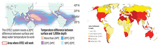 Figure 1 shows the distribution of world surface sea temperature and a map of the world’s predicted water shortages until 2040. As shown in the figure, most countries in Southeast Asia and Oceania are predicted to be capable of ocean thermal energy conversion (OTEC), and, among these countries, countries experiencing water shortage are included. In order to solve such water shortage and power shortage, research on OTEC plants is being conducted. The potential for ocean thermal energy is widespread worldwide, with economic feasibility in at least 98 countries [5]. According to Vega, the sea temperature range is 25–30 °C on the African and Indian coasts, the tropical west and southeastern coasts of the continental United States, and many Caribbean and Pacific islands [6]. Recently, Bernardoni et al. conducted a study on the economic feasibility of Kiribati and Fiji with regard to closed-cycle OTEC, but a more comprehensive comparison is required due to the limited technology and countries investigated [7].