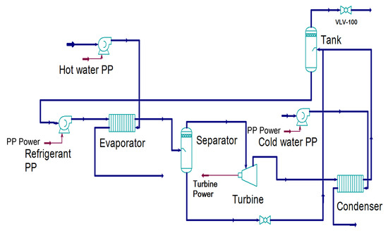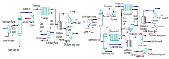 The method of lowering the surface water discharged from the evaporation chamber via two-stage decompression and of storing the generated steam in a freshwater tank through a condenser is called two-stage evaporation open-cycle OTEC. This is suitable for countries with a high water shortage. Figure 2 represent the single-stage evaporation and the two stage-evaporation open thermoelectric cycles. As a simulation analysis method, a process design program called Aspentech HYSYS (V10) was used to analyze the basic OTEC cycle. Helmholtz energy equations with high accuracy including international standard equations for water equations were used [12,13]. Through the Helmholtz energy equation, it is possible to derive an accurate energy value by applying the physical property values of water and R32 refrigerant in the simulation.