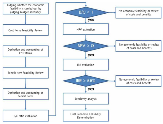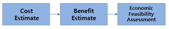 The total cost is largely divided into the total installation cost, which is required for initial installation, and the operating cost after installation. Since an annual operating cost is required, the cost is calculated by adding about 5% of the total installation cost to the annual operating cost. The total operating costs include annual operating, maintenance, repair, and replacement costs, as suggested by Vega [6]. The total project cost is divided into initial capital costs and operating costs, and operating costs include facility and equipment maintenance costs and management operation costs after initial installation. The economic feasibility analysis procedure was carried out in the order of cost estimation, benefit estimation, and economic feasibility evaluation based on the simulation results as shown in Figure 4.