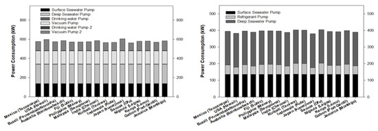 On the other hand, the power consumption according to the cycle tended to be the same for the open cycle and the closed cycle, with the generation of power consumption being up to 404.5 kW in the closed cycle (479.4 kW at open cycle) in the Samoa region. For the closed cycle, average power consumption of 393.8 kW was seen, which was 85.6 kW lower compared to open cycle. In the case of two-stage open-cycle OTEC, an average power required of 98.6 kW was generated compared to the first-stage evaporation, with 1.8 kW in freshwater pump 2 and 96.8 kW in vacuum pump 2. The left side of Figure 6 shows the power consumption of the open-cycle OTEC, and the right side shows the power consumption of the closed-cycle OTEC.