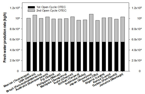 Samoa, where the seawater heat source is 29.3 °C, showed production of 757.6 kW with the single-stage open-cycle model, representing the largest net power generation, whereas Japan showed the lowest power generation of 323.6 kW with the single-stage open-cycle model due to its low heat source temperature of 25.0 °C. In addition, values of 59,332 kg/h and 59,152 kg/h were obtained for freshwater production in Samoa and Japan. Converting electricity and freshwater into production costs, annual revenues of $2,409,000 in Samoa and about $1,417,000 in Japan were reported. However, it was confirmed that Kiribati and Nigeria, which have high costs of electricity and fresh water, were the largest beneficiaries with $4,703,000 and $3,382,000, respectively.
