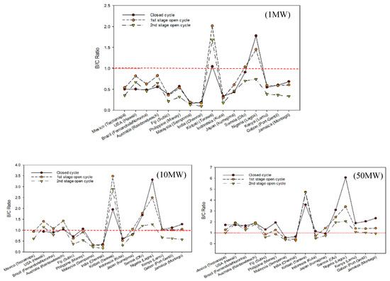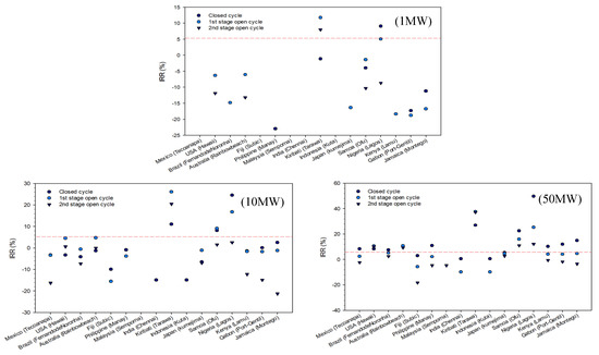 In addition, it was assumed that the initial investment cost was reduced by 15% due to the rise in technological power and deflation. In this case, the 50 MW class CC-OTEC in Fiji had an IRR of 6.08%, showing an increase of 104% from the previous 2.98%. In the case of OC-OTEC, Mexico and the Philippines increased from 2.54% and 2.24% to 5.63% and 5.32% in the single-stage model, while the second-stage OC-OTEC increased from 2.54% to 5.62% in Brazil. Table 4, Table 5 and Table 6 show the economic indicators according to the existing initial investment cost and the change in initial investment cost.
