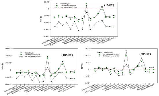 Table 7 shows the results of sensitivity analysis of the 1 MW OTEC applied to Kiribati. According to each power generation method, the initial cost increased by 15% and the NPV increased and decreased by up to 41.83% for the first-stage open type, while the second-stage open type also showed a change of 112.39% according to the initial cost change. In addition, in the case of the closed type, a change amount of 51.0% was established according to the initial cost change. Excluding the initial cost, NPV was the highest in the open type due to changes in the water tariff, where values in the first- and second-stage open-cycle OTEC (32.58% and 92.58%, respectively) increased and decreased. On the other hand, in the case of the closed-type OTEC, the increase and decrease amount was 36.0%, representing the highest change rate in the electric tariff category. The sensitivity analysis of OTEC varied depending on the development method and region, and this comparison was based on the Kiribati model.