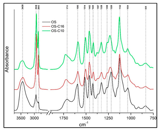 Figure 1. FT-IR spectra of nonfunctionalized organosolv (OS) lignin etherified with C10 (OS-C10) and C16 (OS-C16) alkyl chains.