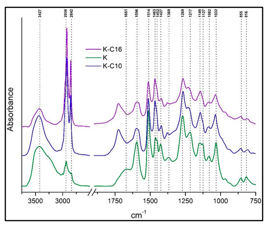 Figure 2. FT-IR spectra of nonfunctionalized Kraft (K) lignin etherified with C10 (K-C10) and C16 alkyl chains.
