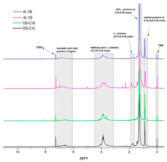 NMR analysis based on 1H and 13C NMR spectra is a powerful tool for characterizing lignin functionalization. After etherification, lignin samples become highly hydrophobic in nature and thus highly soluble in low-polarity solvents, such as chloroform, diethylether. In this case CDCl3 was used as NMR solvent due to high solubility of etherified lignin samples. In 1H NMR spectra, the broad triplet signal around 0.87 ppm was assigned to methyl protons of C10–C16 alkyl chain units (Figure 3). The strong broad peaks around 1.2 ppm were assigned to all methylene protons (except α, β methylene protons) of C10–C16 alkyl chain units. The broad signal around 1.5–1.8 ppm was attributed to β methylene protons of C10–C16, whereas that of α methylene protons appeared around 3.8 ppm as a broad signal together with lignin methoxy groups. Aromatic and vinylic protons of lignin appeared around 6.1–7.0 ppm, although signal intensity was very low compared to aliphatic signals of C10–C16 chain units.