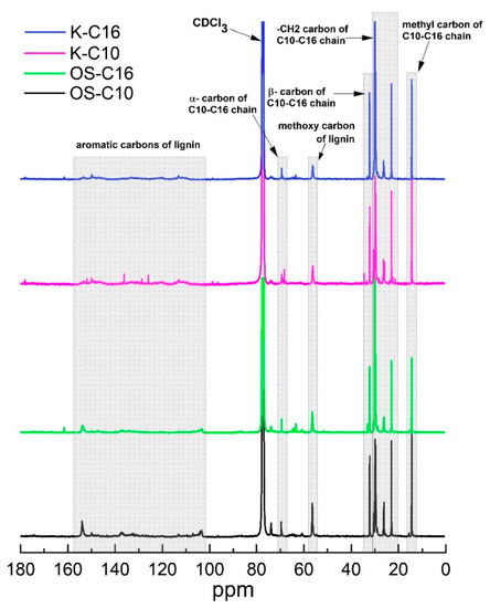 In 13C NMR spectra, the methyl carbon of C10–C16 chain units appeared around 14.4 ppm (Figure 4). Signals from methylene carbons (except α, β methylene carbons) of C10–C16 alkyl chains appeared between 22.9–30 ppm. The signals between 32.1–32.2 ppm were assigned to the β carbon of C10–C16 aliphatic chain units, whereas that of the α carbon was found around 69 ppm. The methoxy carbons of lignin appeared around 56.6 ppm. Aromatic carbons of lignin showed a very low signal between 102–156 ppm compared to C10–C16 aliphatic carbons. NMR signals of etherified lignin samples reflected previously reported O-alkyl phenolic compounds and thus further confirmed the successful etherification of lignin [45,46], as suggested also by high solubility in low-polarity solvents, such as chloroform and diethylether.