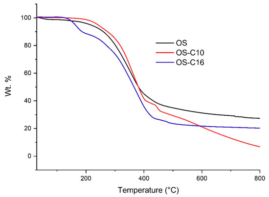 In the first case, organosolv lignin and its alkylated thermoplastic lignins were analyzed. In our case degradation of native organosolv lignin was observed relatively easily, even at <80 °C, possibly due to internal radical coupling reactions [50]. Initial 2% weight loss of native organosolv lignin were observed around 143 °C. From the TGA plot (Figure 5), it is evident that thermal stability increased significantly after ether functionalization and was highest in case of organosolv lignin etherified with C10. T0.5% of OS-C10 was observed around 174 °C; whereas OS-C16 reached 135 °C. The highest T1% was observed at 193 °C for OS-C10; whereas T1% for OS-C16 was 140 °C. Similarly, T2% of OS-C10 was around 213 °C, which is substantially more than the values for OS-C16, which was 148 °C.