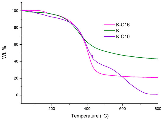 On the other hand, the degradation of native Kraft lignin was also relatively facile like organosolv lignin and started even <80 °C. However, a 2% weight loss in native Kraft lignin was observed around 133 °C. Interestingly, etherified Kraft lignin also displayed good thermal stability (Figure 6), with the K-C16 sample exhibiting 0.5% decomposition at 148 °C, whereas K-C10 showed very poor thermal stability T0.5% at 75 °C. Furthermore, T1% of K-C16 and K-C10 were found to be 156 °C and 88 °C. Although 2% degradation of K-C16 was comparatively high 168 °C but K-C10 showed lower thermal stability 104 °C than its native Kraft lignin 133 °C. Finally, non-functionalized lignins (especially the Kraft one) produced a higher amount of char at 800 °C compared to etherified lignins. This is probably due to formation of highly fused polycyclic aromatic hydrocarbon compounds via coupling of free phenolic hydroxyl groups.
