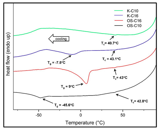 Tg and melting temperature (Tm) are crucial for choosing the most appropriate candidate thermoplastic application and can be measured by DSC analysis. Tg of non-functionalized organosolv lignin was found to be very broad and centered at 117.1 °C and for commercial Kraft lignin is reported at 153 °C [51], although both lignin starts to decompose also at lower temperature. This finding indicated that non-functionalized lignin did not exhibit true Tg and could not be used in thermoplastic applications, as it would decompose during the thermoforming process. On the contrary, ether functionalization of organosolv lignin led to a sharp Tg peak and the detection of Tm (Figure 7). Importantly, controlling the alkyl chain length during etherification allowed the control of Tg, opening the opportunity for fine-tuning the thermal properties of the generated thermoplastics in accordance with the required application. During DSC analysis, samples were initially heated to 100 °C to form a thin film and then gradually cooled to −80 °C prior to starting up the heating/cooling cycles. During the cooling part, a small dip around 40–43 °C was observed for almost in all samples and it was ascribed to the endothermic peak of crystallization (Tc). As all lignin samples were highly amorphous, the endothermic peak of Tc was small and was observed only during the cooling cycle. This small endothermic peak of crystallization occurred possibly due to the introduction of alkyl chain into the lignin structure, which induces alkyl stacking in lignin thermoplastic [52,53,54,55]. Another endothermic peak, corresponding to Tg, was observed when lignins were cooled further to a lower temperature. OS-C10 presented the lowest Tg (−45.6 °C), while OS-C16 showed a sharp endothermic peak around 9 °C, further confirming how variations in alkyl chain length could serve to fine-tune the thermoplastic properties. Finally, the Kraft lignin K-C16 sample exhibited glass transition around −7.5 °C (Figure 7), whereas K-C10 failed to show any Tg throughout the heating or cooling cycle. This was probably due to its broad molecular weight distribution with high polydispersity index (3.38) compared to other lignin samples.