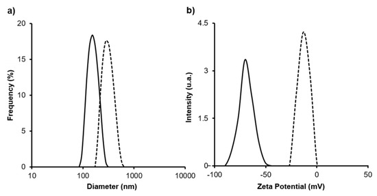 (a) Size distribution and (b) zeta potential of liposome (solid line) and PTX-ANA co-loaded liposome (dashed line).