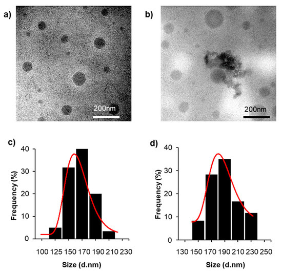 Transmission electron microscope image and particle size distribution of (a,c) LP and (b,d) PTX-ANA-LP.