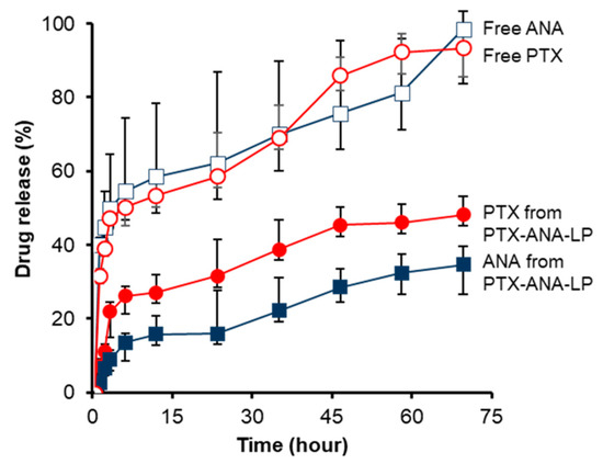 Release profiles of free PTX, free ANA, and PTX and ANA from PTX-ANA-LP at 37 °C in phosphate buffered saline (PBS, pH = 7.4; n = 3, mean ± standard deviation).