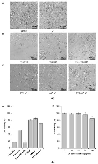 (a) Images of c-7 cells incubated with (A) Control, LP (100 µg/mL), (B) free PTX, free ANA and free PTX-ANA, and (C) PTX-LP, ANA-LP and PTX-ANA-LP for 24 h at a concentration of 1 µg/mL (scale bar = 100 nm). (b) Viability of MCF-7 cells incubated with (A) free PTX, free ANA, free PTX-ANA, PTX-LP, ANA-LP and PTX-ANA-LP at a concentration of 1 µg/mL and (B) LP at different concentrations for 24 h. The data represent the mean values ± the standard deviation (SD) (n = 4).