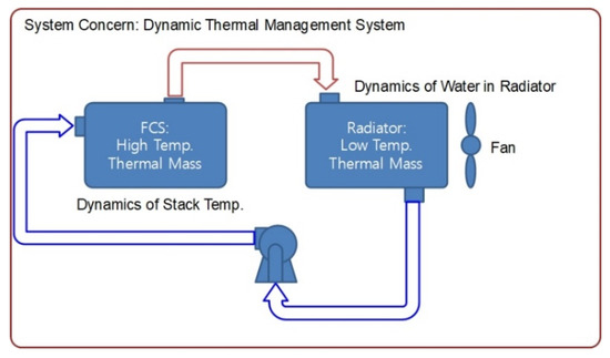 The total mass of water present in the reservoir, radiator, and cooling channel of the stack is 7 kg. A bypass valve and radiator fan are used to control the coolant inlet temperature. The dynamic thermal management system with fault diagnosis is shown in Figure 3.