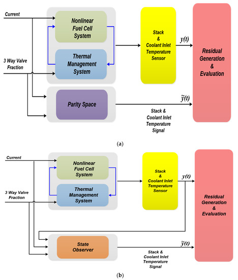 Schematic diagram of proposed model-based fault detection for cooling system sensor ((a) Parity method, (b) State observer and Kaman filter method).