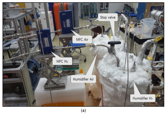 The I-V characteristic curve of the fuel cell is generally used to verify the fuel cell system model. In this study, the test bench for the unit cell was constructed to conduct model verification to confirm the accuracy of the model in terms of the static characteristics. Figure 5a,b shows the test bench for the unit cell and the validation results. The test facilities were composed of a unit cell, an MFC to measure the flow rates, a humidifier to humidify the gases, an air fan to reject the heat in the unit cell, and other sensors. The active area of the fuel cell stack is 25 cm2, the stack temperature is 70 °C, and the pressure of anode and cathode is 3 atm. To verify the designed fuel cell model, a turning coefficient was selected. Details of the tuning coefficients can be found in our previous research [25]. As shown in Figure 5b, I-V performance curves between the experimental data and the model over time are in good agreement.