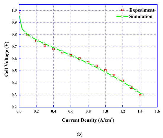 Unit cell test bench and results of validation of I-V curve ((a)—unit cell test bench, (b)—results of validation of I-V curve with experimental data).