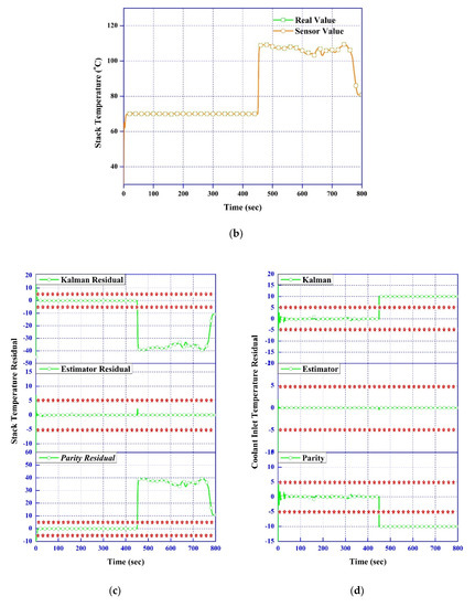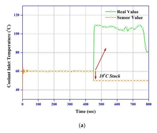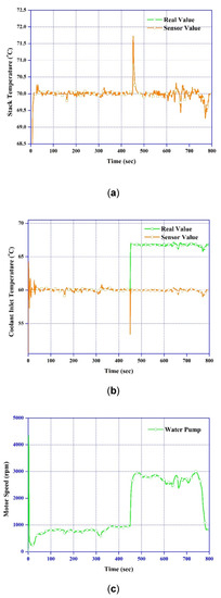 Similarly, coolant inlet temperature sensor detection and isolation in the case of a coolant inlet sensor stuck fault was evaluated under HWFET cycles based on the current density. Taking a fault resulting from the coolant inlet temperature sensor being stuck at 10 °C upon injection into the coolant inlet at time 450 s, the detection and isolation results are plotted in Figure 8. Figure 8a,b shows the value measured by the temperature sensor and the real temperature value of the stack and coolant inlet, respectively. Figure 8a,b indicates that the real stack temperature increased after 450 s, because the radiator fan stopped. Because the real coolant inlet temperature increases, the stack temperature increases continuously, even though the water pump speed increases. Thus, a faulty coolant inlet temperature sensor can cause critical damage to the fuel cell stack.