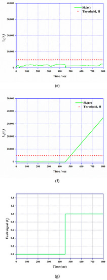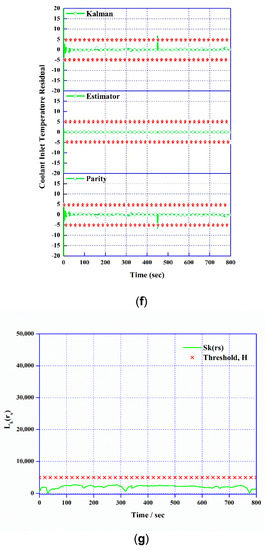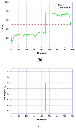 It can be seen from Figure 9e,f that the parity and Kalman filter residuals of the stack responded to this fault in the form of a peak, in contrast to the estimator residual, which responded only slightly. Furthermore, Figure 9e shows that the residuals of the stack temperature hardly responded to this fault. Especially, the maximum peer value cannot be exceeded in the case of the three residuals. That is why the temperature measured by the stack temperature sensor recovered immediately because of the water pump. On the other hand, the estimator residual of the coolant inlet temperature did not respond to this fault, whereas the parity and the Kalman filter residuals exceeded the threshold value. According to the residual characteristics in Table 2, fault f2 will be detected when the coolant inlet temperature sensor responds to this fault. Unlike the stuck case, the residuals of the stack and the coolant inlet exist in the form of a peak. This is why the controllers of the water pump and the radiator fan continue operating in the case of a sensor scaling fault. The CUSUM test results indicate that a fault occurred in the coolant inlet temperature sensor, as shown Figure 9g,h. The coolant inlet temperature Lk(r(c)) crossed the allowed threshold value at 450 s, and Lk(r(c)) was maintained. On the other hand, the coolant threshold did not cross the specified threshold value. Thus, a sensor fault in the coolant inlet temperature sensor was indicated. Finally, the isolated fault signal f2 is shown in Figure 9i.