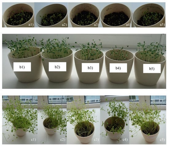 (a) The garden candytuft appearance (a) after five days of cultivation; (b) after ten days of cultivation; (c) after forty days of cultivation: (a1/b1/c1) control sample; (a2/b2/c2) in humus with the addition of egg shells; (a3/b3/c3) in humus with the addition of extra humus; (a4/b4/c4) in untreated humus watered with CuSO4∙5H2O; (a5/b5/c5) in humus with the addition of zeolite NaX.