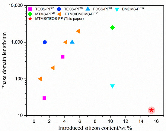 With the demands of long-term ablation performance in aerospace applications, high content of anti-oxidant components such as polysiloxanes is expected for the hybrid phenolic resins. In order to avoid macroscopic phase separation, the interaction between polysiloxanes and phenolic resins should be tremendously increased. Li et al. [22] prepared a novel amphiphilic molecule (coupling agent) and conducted copolymerization to synthesize hybrid resin. A large amount of siloxane (more than 30 wt.%) was introduced, and co-continuous phase structure with periodic length (60 nm) was formed in the cured hybrid resin. However, high-cost and complicated synthesis process and low thermal stability were not beneficial for the application of the coupling agent. As shown in Figure 1, by comparing phase separation length and silicon content of various silicon modified phenolic resins [16,20,21,22,31,32], it was found that fine phase structure and high silicon content are difficult to achieve at the same time. Therefore, a high-performance silicon-modified phenolic resin with high silicon content and fine phase morphology is expected to develop by simple and economical preparation methods.