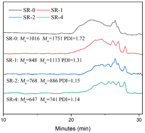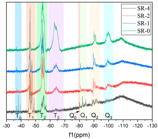 The simplified hydrolysis and condensation reactions of TEOS and MTMS were shown in Scheme 1. The structure of Q0, Q1, Q2, Q3, Q4, T0, T1, T2, T3 for silicon resins were also displayed in Scheme 1 [33,34]. Figure 2 shows the liquid-state 29Si NMR result of silicon resins. It revealed that the structure of the oligomer was formed, while the existence of T0, T1, T2, Q0, Q1, Q2, Q3 indicated that the condensation reaction between MTMS and TEOS was incomplete. With the amount of ethanol decreasing, the signals of T2, T3 and Q2, Q3 became stronger, which illuminated that ethanol dosage can inhibit the condensation reaction of siloxane. The effect of the ethanol can be concluded in two aspects. On the one hand, ethanol diluted the concentration of reactants; on the other hand, ethanol, as a product of hydrolysis reaction, can inhibit the hydrolysis reaction [33]. Thus, the polycondensation reaction slowed down, which led to a lower degree of condensation. As the GPC result shown in Figure 3, with the amount of ethanol decreasing, the number of average molecular weight (Mn) and weight-average molar weight (Mw) of SR samples increased; and the polymer dispersity index (PDI) also increased. It indicated that ethanol worked as an inhibitor for the polycondensation reaction. A higher ethanol amount resulted in a lower condensation degree, and more Si-OH groups were expected to be left.