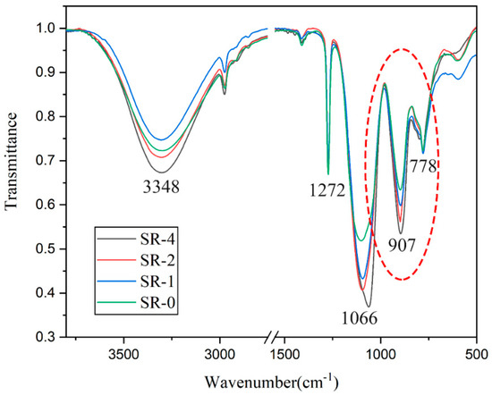 FTIR was used to characterize the structure of SR, and the spectra are shown in Figure 4. Signals at 1272 cm−1 and 778 cm−1 were assigned to Si-CH3, which will not join reactions and can be used as an internal reference. The broad absorption band appearing at 3000–3600 cm−1 was attributed to the stretching vibration of -OH in silanol groups (Si–OH) and alcoholic hydroxyl groups. Peaks at around 907 cm−1 and 1066 cm−1 were ascribed to stretching vibration of Si–O in silanol groups and Si–O–Si groups. The amount of residual Si-O-CH2-CH3 and Si-O-CH3 in SRs are characterized by NMR (Figure S1), and it was indicated that most of Si-O-R were hydrolyzed to Si-OH. With the amount of ethanol increased, the intensity of the Si–OH peaks increased, while that of the Si–O–Si signals decreased and blue-shifted. It revealed that the hydrolysis and condensation reaction of Si–O–CH3/C2H5 in MTMS and TEOS has occurred, and the higher amount of ethanol added, the lower degree of condensation and the higher content of silanol groups was obtained. Chemical structure of silicon resins can be changed by modulation of hydrolysis and condensation reaction of siloxane.