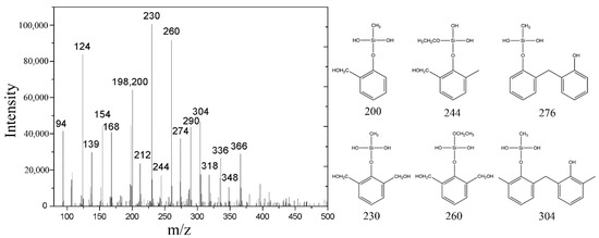 To study the chemical reactions in the early curing process, the chemical structure of SPF-4 resins cured at 80 °C for 2 h was analyzed through FD-MS, and the results are shown in Figure 6. Ion fragment signals at 94 m/z, 124 m/z, 154 m/z, 290 m/z, etc., were characteristic peaks of phenolic resins and the chemical structures of other strong signals are listed next to the spectrum [35]. Ion fragment peaks at 200 m/z, 230 m/z, 244 m/z, 260 m/z, 276 m/z and 304 m/z indicated that Si-OH had reacted with Ph-OH to generate Si-O-Ph in the early 80 °C curing step before the SPF-4 resin gelled.